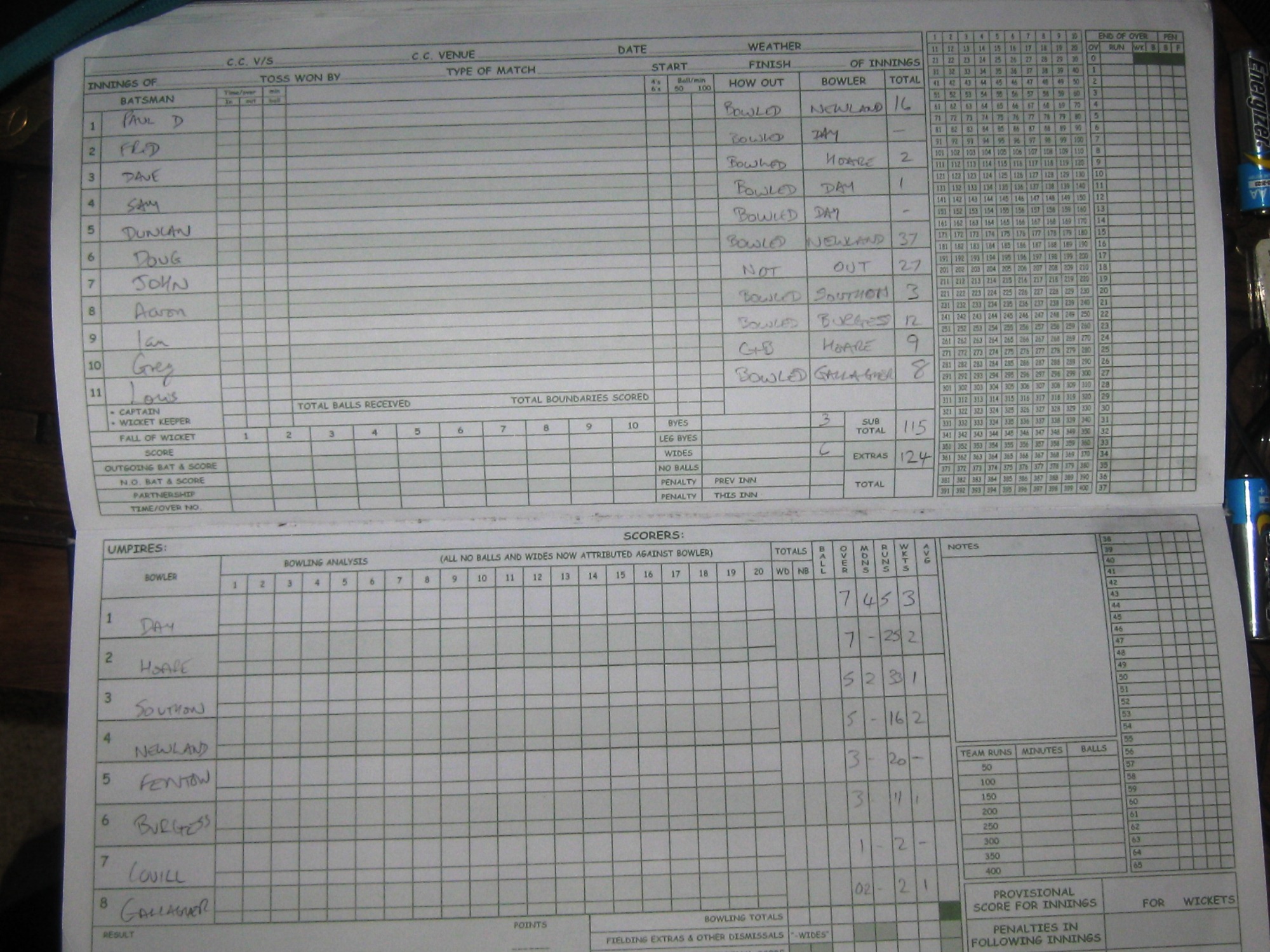 The tea , provided by David ‘Kid’ Hadrill (and Chrissy), was absolutely super ,kings it was fit for! With all that on board Cutters had as much chance of chasing down the total as a camel has of winning the Derby and the Greys openers did early damage with Overlord claiming 3 for 5!