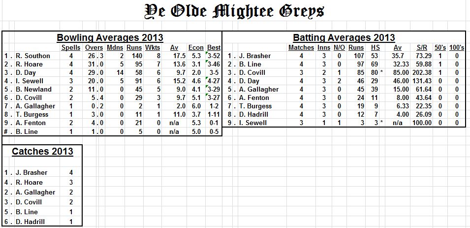 The Greys first game in Brighton since B&H Crescent last year was against new opponents , Cutter’s Choice, at Horsdean. With predictions from Alex’s Norwegian weather people of a hurricane monsoon , a fine spring day greeted the players. The Greys skipper called tails again (as it was their home game but they “don’t do tea”!?)and finally the sovereign landed that way up , the Greys were batting!