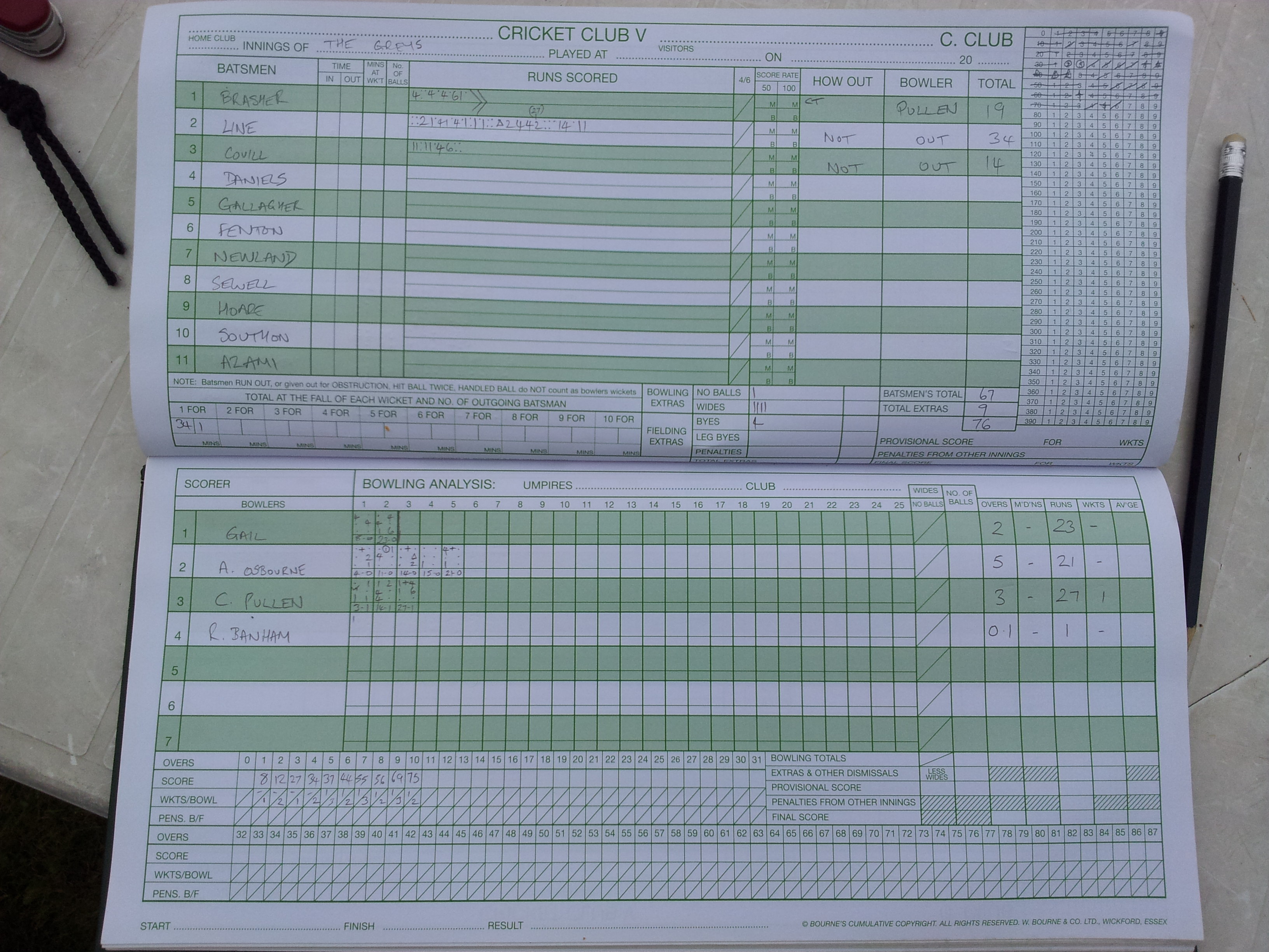 The home team’s lively start was soon halted by Southon’s first spell which brought to mind a slo-mo Mike Hendrick in his pomp. They simply had no answer. The middle order tumbled, unable to respond to the fine ‘pressure cricket’ served up by The Greys. Spells by Hoare and Newland led to kamikazi batting. The midges were away as catch after bloody wonderful catch was cupped. Oh my god. Their openers’ temerity to take on a Newland half volly on leg plucked by Scoopman from the bucolic air round about long on.