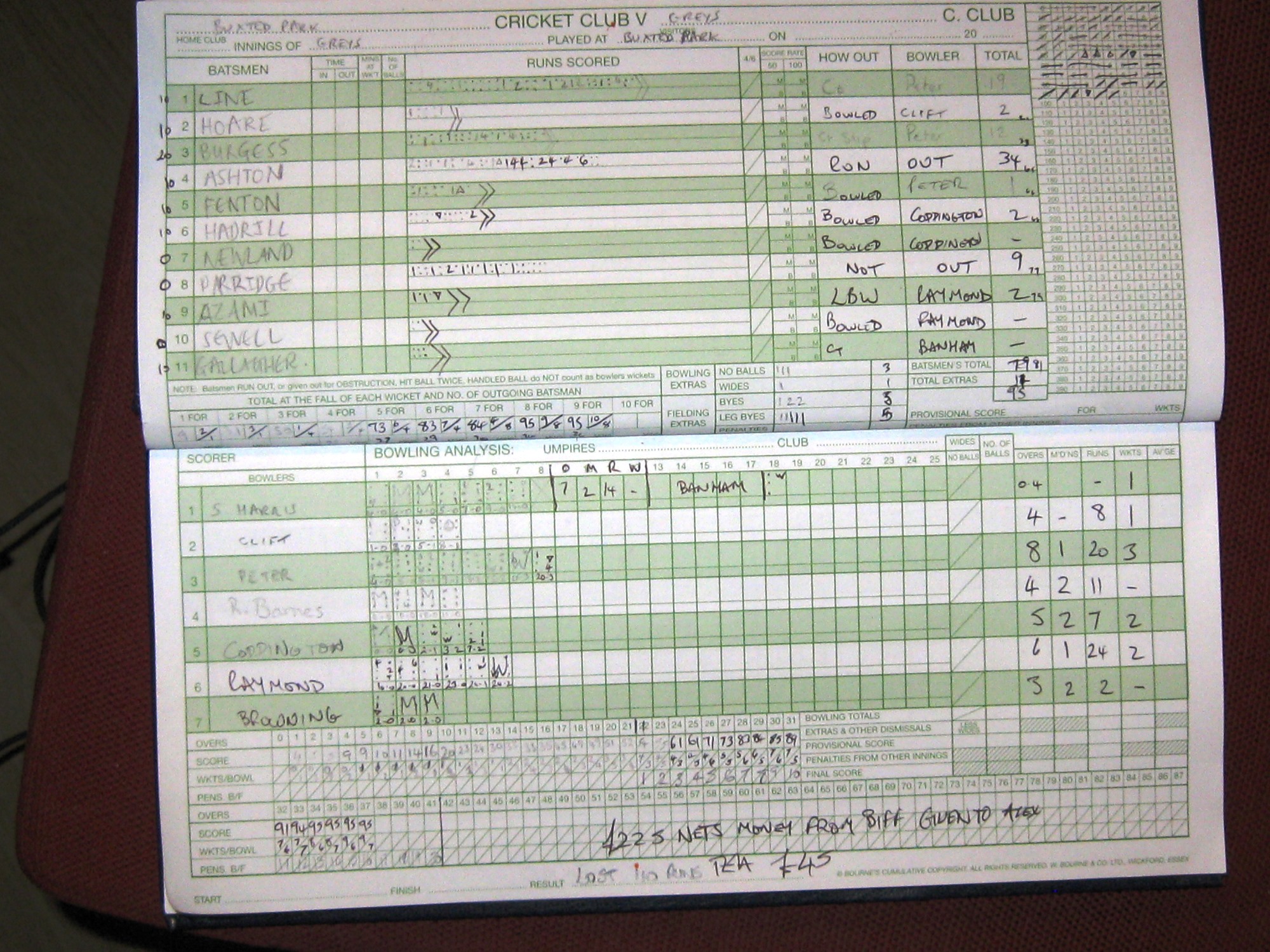 Unfortunately for The Greys this dismissal brought Buxted Park’s overseas pro to the middle and to cut a long story short he smashed us all over the place. He damaged all the bowlers figures on his way to a hundred, but thankfully once he’d reached three figures he retired. When not bowling at someone who actually gets paid to play cricket The Greys bowlers did quite well. As already mentioned E.O kept things pretty tight, QB (2 for 56) produced a couple of classic QB in swingers to dismiss the No. 5 & 6, and Biff snuck in at the end to take 2 for 6. Ibu and Richy also bowled well, keeping the scoring rate reasonable at the end with batsmen looking to score on what was a good batting surface. In the end Buxted Park scored 205 for 6, an imposing total even in good batting conditions.