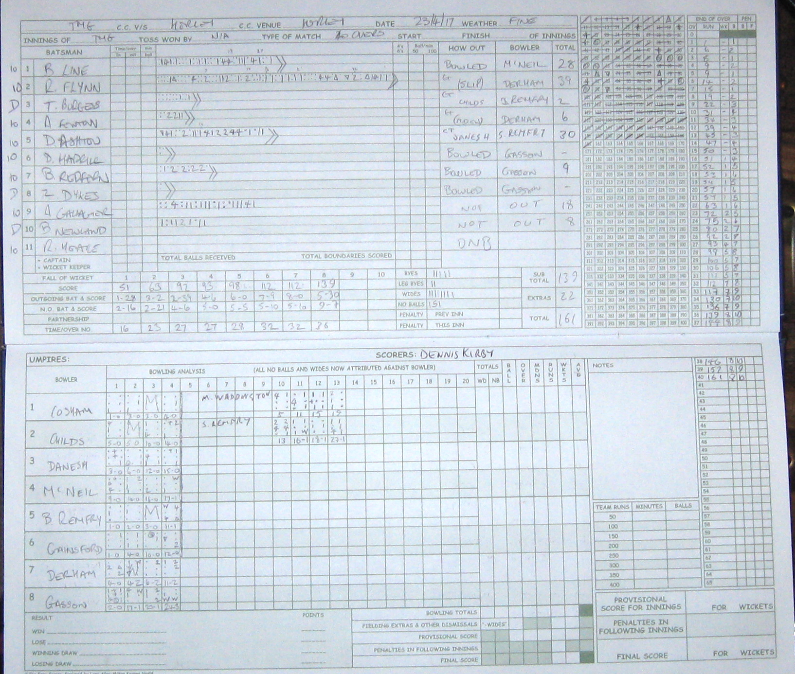 The 23rd of April saw the start of a new season for The Mighty Greys, and brought new opposition in the shape of Horley. The Greys batted first on what looked like a good pitch, especially this early in the season, and got off to a very solid start. Hatrick had moved up to open with the skip and looked every part the opening batsman. Together they put on 51 for the first wicket, a partnership of crushing cut shots from Biff and textbook drives from Rick. Biff was eventually out for 28 but Rick carried on to make his highest score for the Greys, a classy 39 before being well caught in the slips. The bowling from Horley was pretty decent, and the Greys middle order failed to make much of an impact. The slower bowlers from Horley induced a number of across the line swipes from various Greysmen with Alex, Terry, The Kid and Zach going cheaply. Dom played well for his 30, and with contributions from Evil Ben, Alan and Good Ben the greys managed to scramble to 161 from their 41 overs. It wasn’t a bad score but another 20 or so would probably of been closer to par.