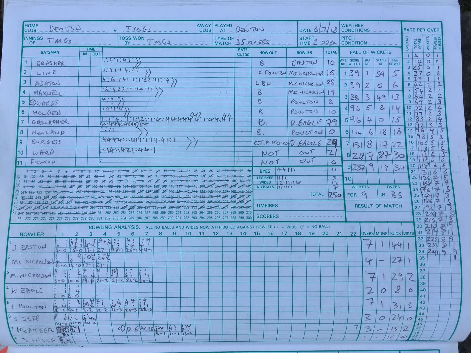 TMG’s defence of 250 started about as well as could be hoped for, with one Denton opener having a big swipe at the skip (2-12), missing, and being bowled (as we see at least once a week) for 0. His partner soon followed him back to the pavilion having been run out by James swooping in from the covers, and James (3-22) also accounted for the number 3, clean bowled soon after. Up next was our PSM winner. Having been told to stop talking to the square leg umpire by the skip, and moved into a catching position behind square on the leg side, Alan produced a fine diving catch, importantly incorporating a textbook Judo roll for extra cool points, to get rid of the oppo number 4. Zach came on and bowled well for a wicket (1-13) before the main event, Duncan Edwards coming on for his first ever spell for TMG (Editor’s note: technically his second, but let’s not split hairs). As we all expected, it wasn’t long before the batsman was as befuddled as if Duncan had been talking to him in the pub, and Duncan had his first wicket for the Greys, ending up with 1 for 13. Biff and Jerry had a bit of a bowl, with Biff getting a wicket (1-26), before Dom was brought on to finish the match, quickly taking the final two wickets to end the Denton innings on 145, well short of the target, which never looked in any real danger of being overhauled.