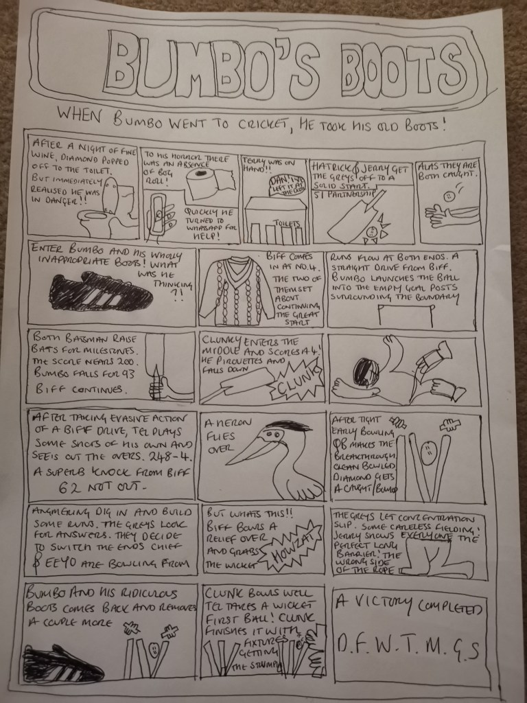 This week’s match report comes in the form of a comic strip… a Grey’s first I believe? (Full text transcription below for accessibility purposes)