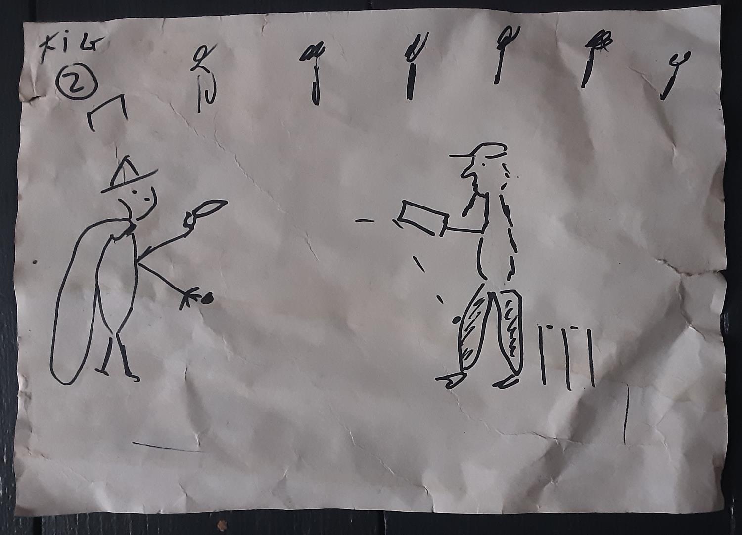 This brought the tribal elder into the battle; we feel he is an important member of the tribe as he is the only one with colourization on the scroll which reflects his standing within the tribe and the fact that he has remained alive considerably longer than any other tribal member. Interpreting this scroll (fig 3) is difficult but seems to show him using his hypnotic brilliance to bamboozle the Angmeringman by bowling not at the phallic obelisk (as is the custom) but many widths to the side; confused the clubber wildly swung his club , under edged the red egg onto Fentonjustabouterectus’s foot to then nestle in-between GOTY’s thighs. A truly amazing incident which had never been recorded before or since. There was still time for Biff to revolutionise the technique of red egg stopping in a particularly relaxed fashion and even to this day the smile is still clearly visible on his face (fig 4).