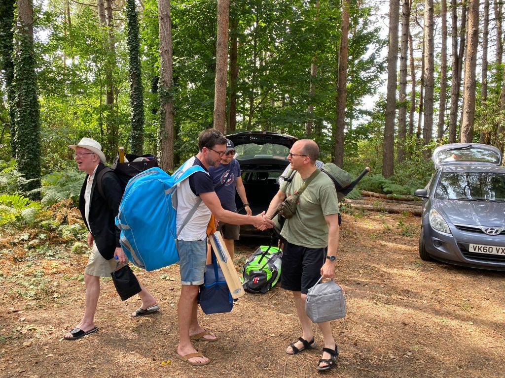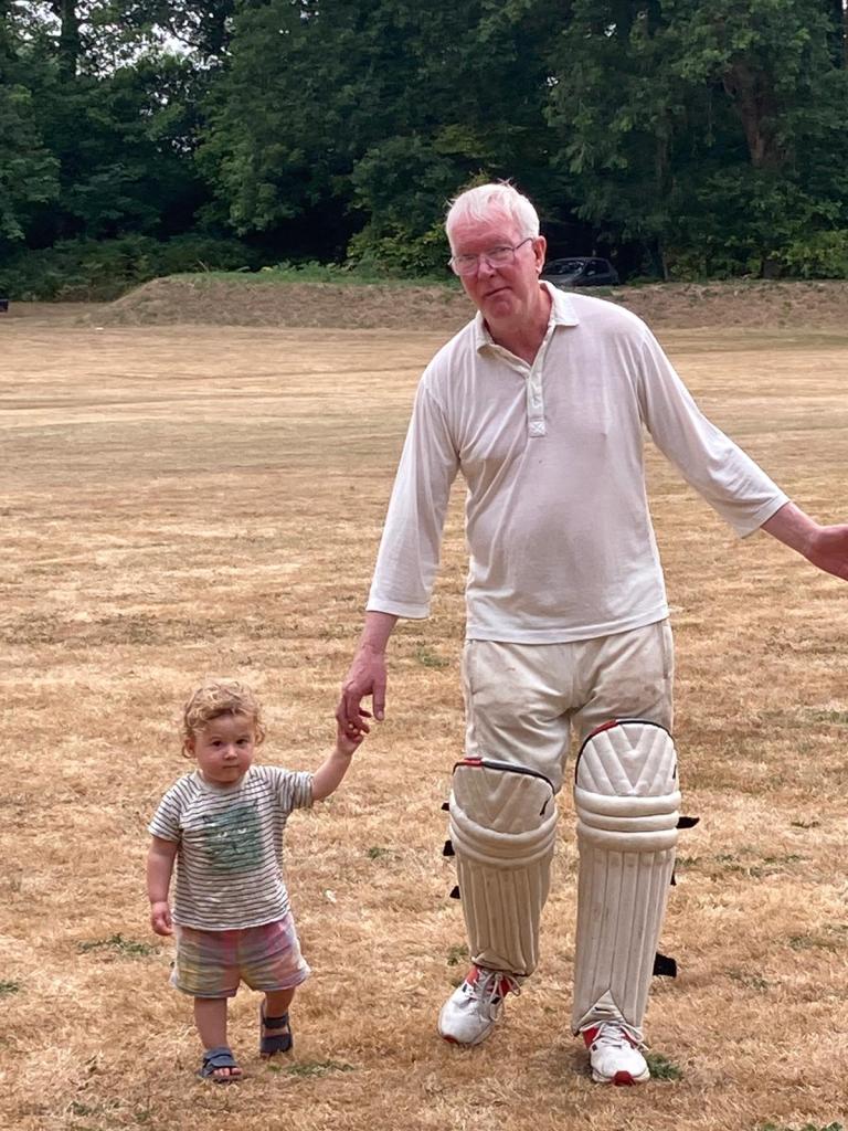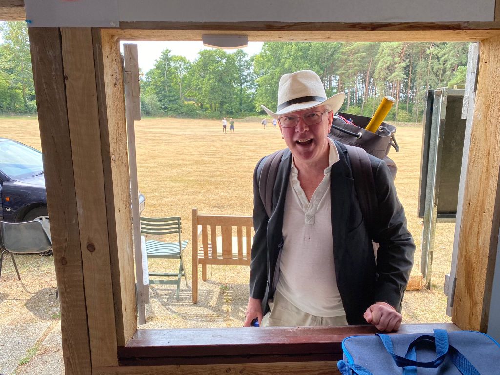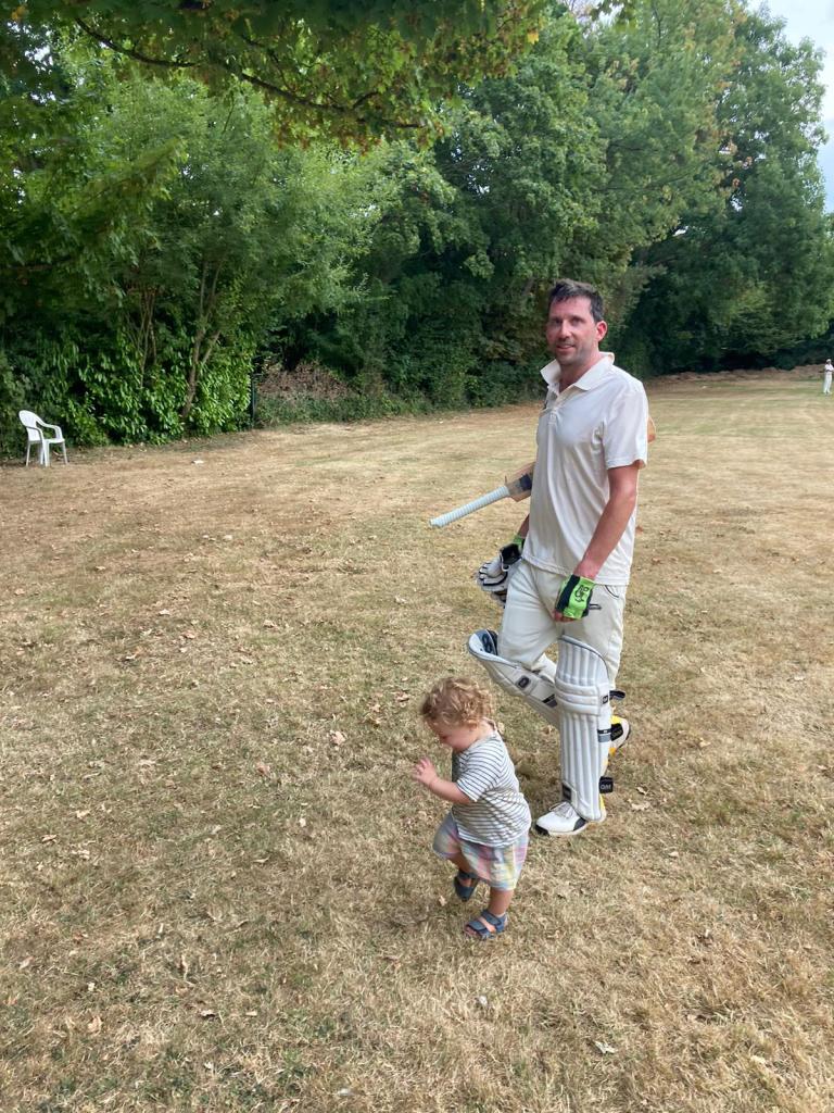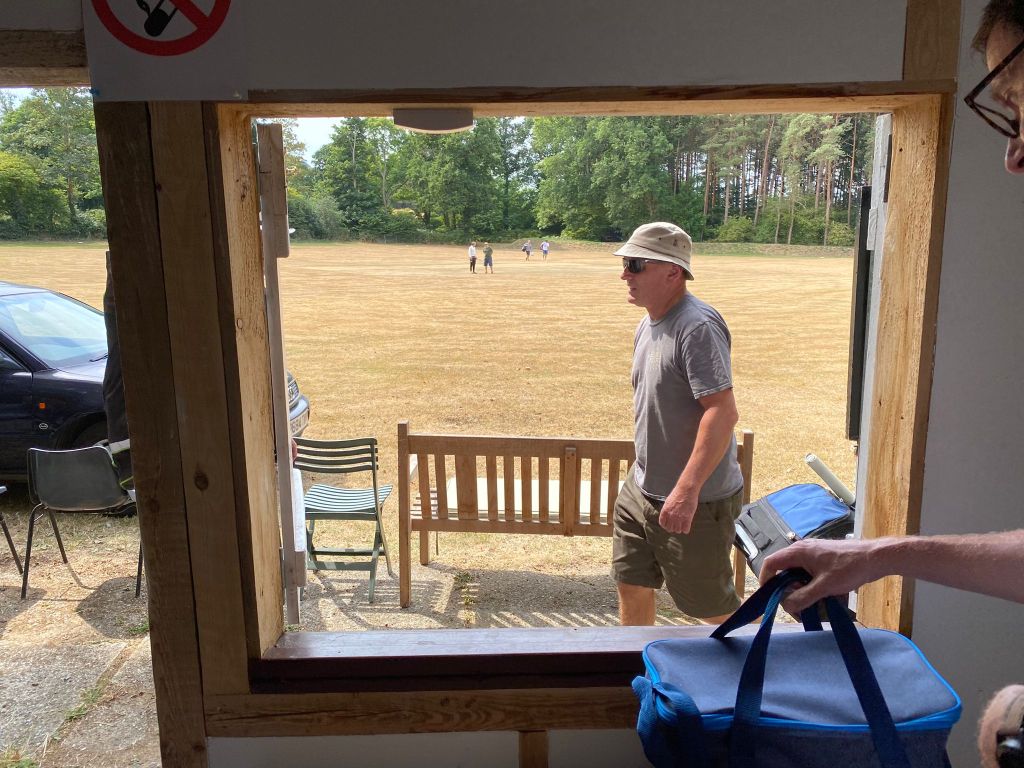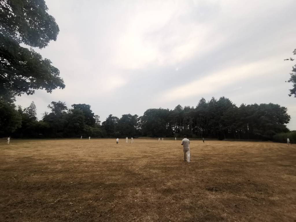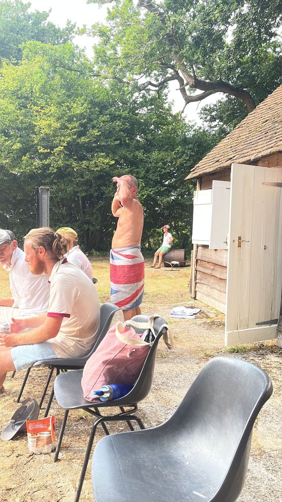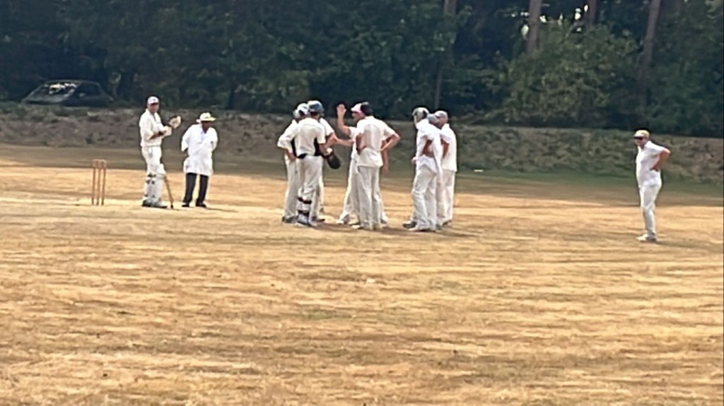 That 6 appeared to destroy the confidence of the young bowler despite having been unplayable for most of the day and his following over sprayed all over and went for 16 byes. Although this helped TMGs reach our target, it robbed Jerry and Clunk from getting their 50 and 100 respectively. Jerry spent a lot of the innings watching as Clunk smashed the ball about – he even found himself gazing admiringly at his own lofted straight drive over the bowler’s head and didn’t bother running despite two fielders bearing down to stop the ball reaching the boundary.