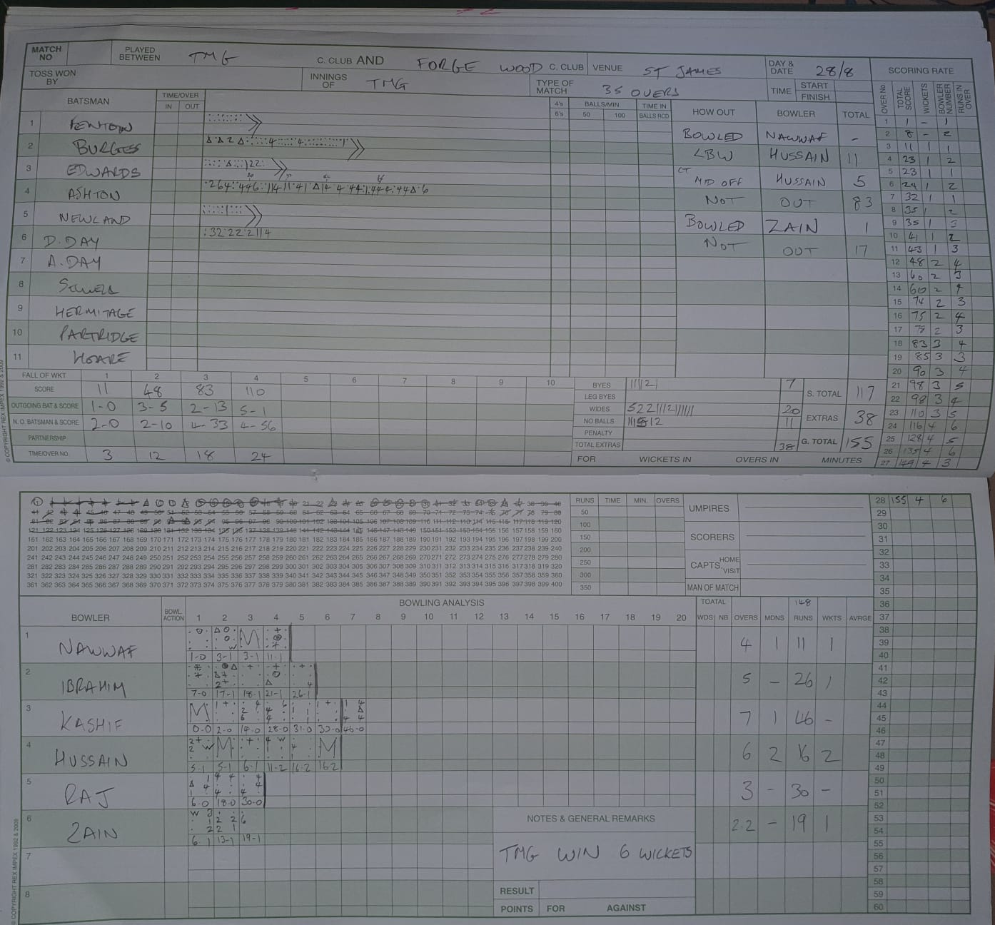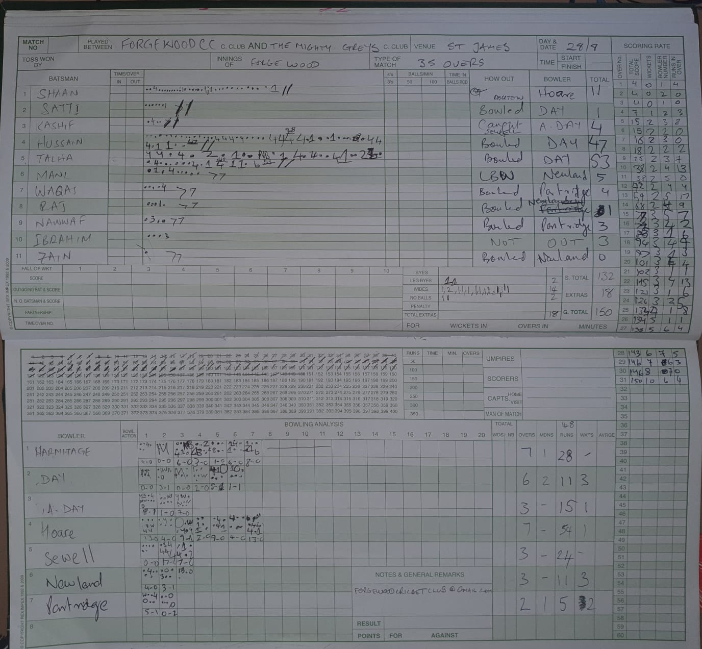 Teen Day then entered the fray- his second appearance for The Mighty Greys. If he improves this much with each appearance then we have a serious bowler on our hands. Dangerous away swing and great perseverance was rewarded with his second wicket in as many games. Good stuff.