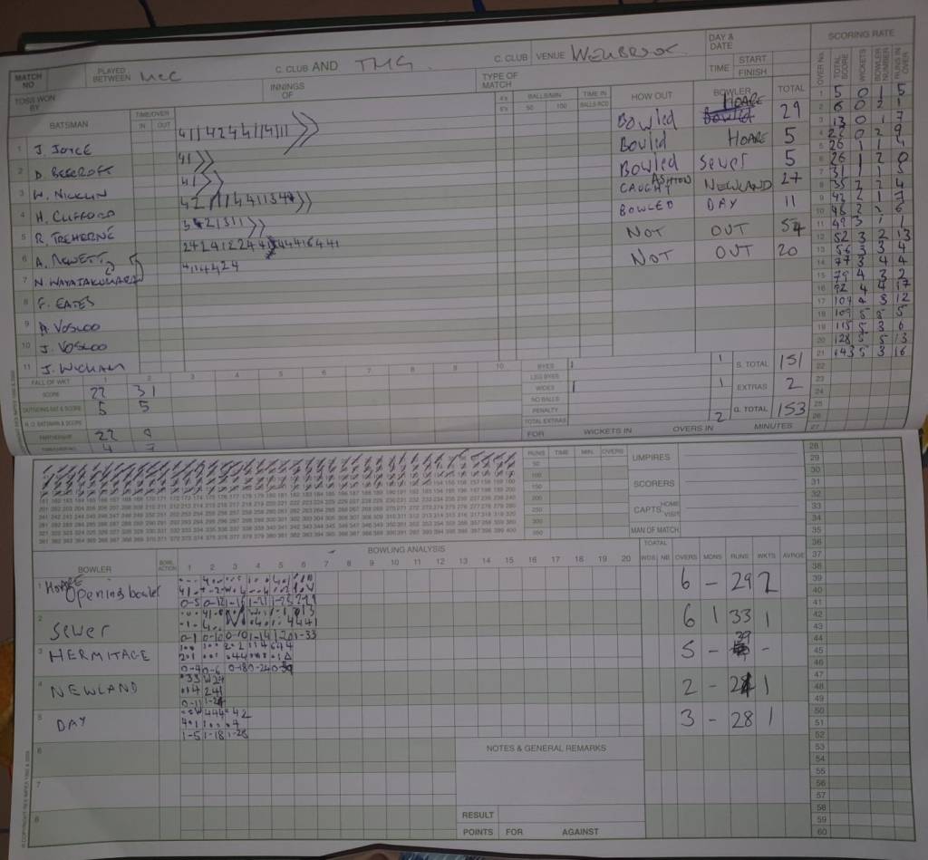 The Mayfield openers looked young so the captain held back his prime beef and brought on stringy geriatrics Hoare & Sewell – appropriately recorded in the Mayfield scorebook as “opening bowler” and “sewer”.