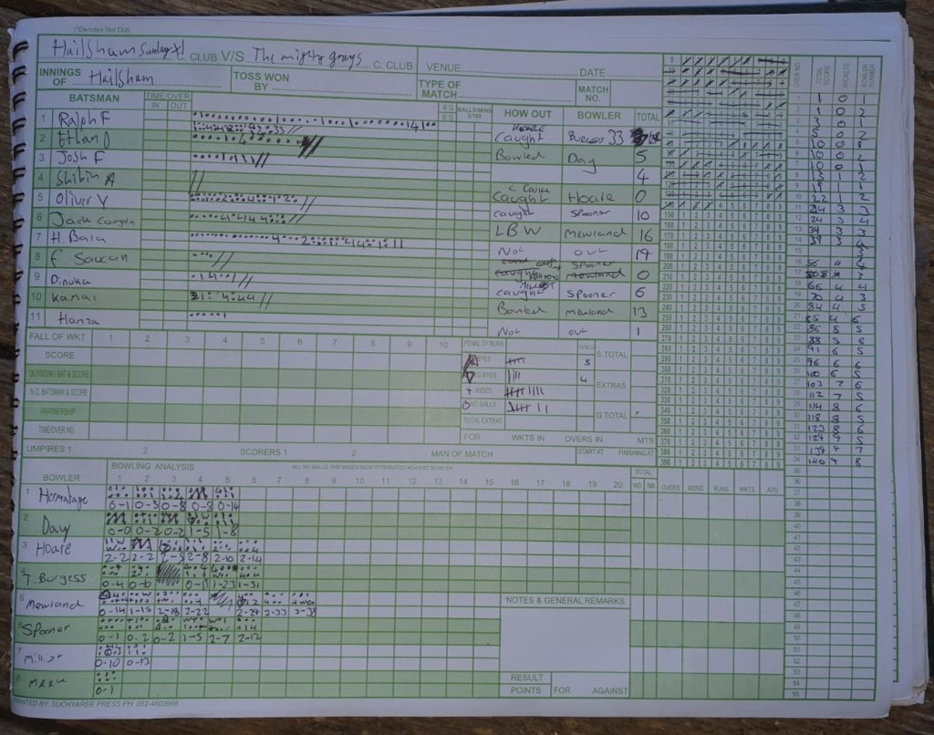 The Greys batted first with Adam and myself opening up. Initially I found myself in the role of (w)anchor as Adam flashed and dashed his way to a quick-fire 27. Some of his shots, especially a couple of front-foot drives, were definitely worth being celebrated, but from my notes I see he only received a nom for trying to field the ball with his face much later in the day.