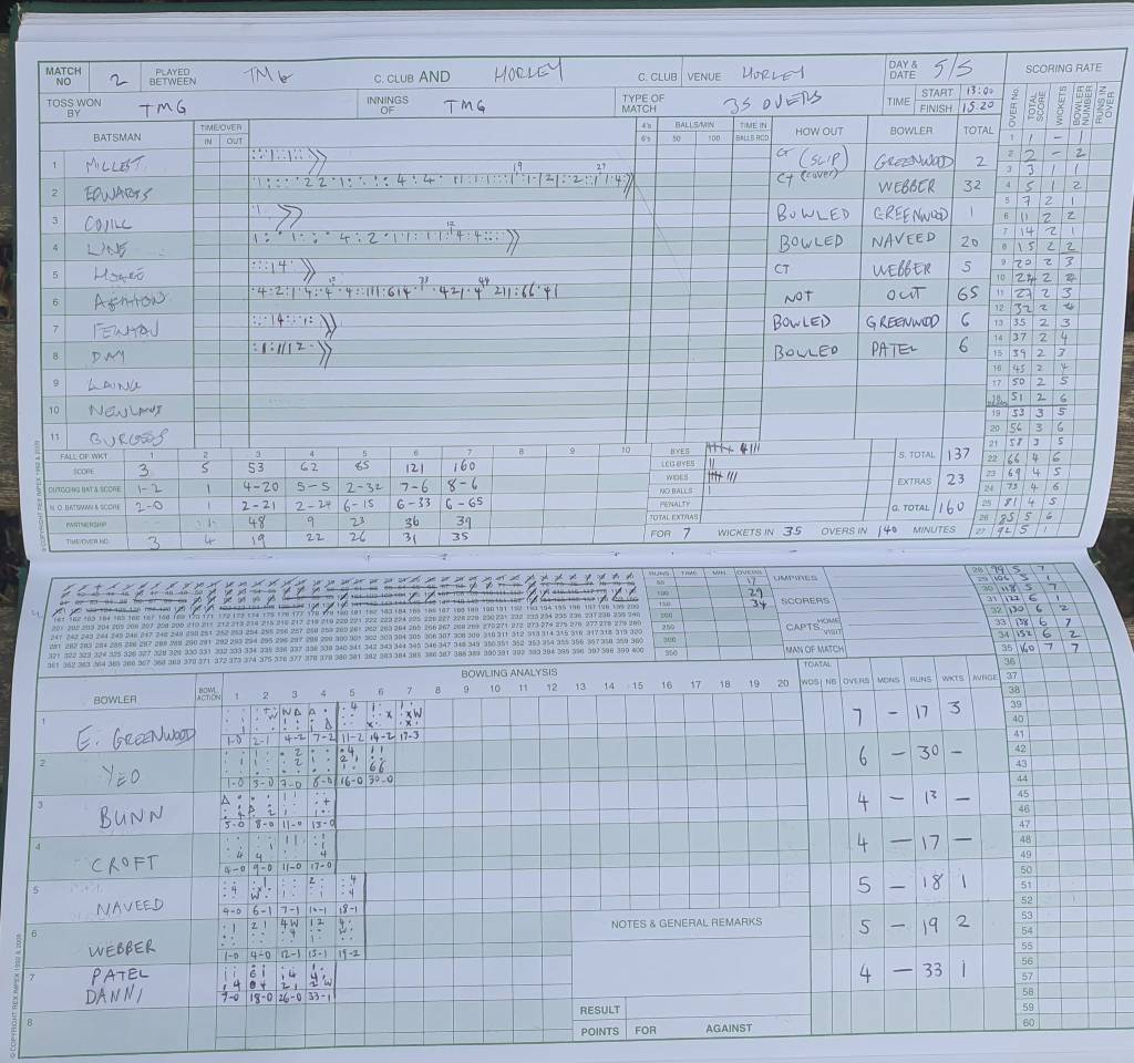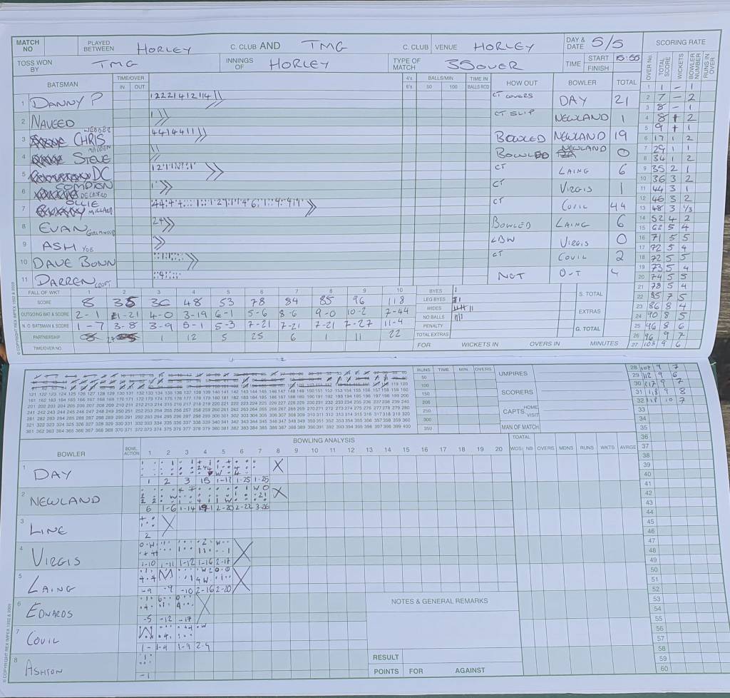 After a decent tea DD and QB, bowling with control and flair put TMG in a strong position four wickets down only for Dave’s back to go.Hope you get well soon from everybody.