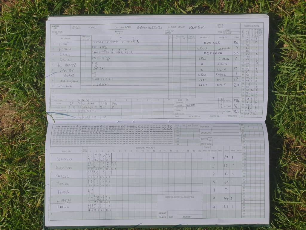 The score was 124 for 1 when Tim retired and the Greys appeared to be cruising. This proved to be the case and despite a steady fall of wickets (including Dom uncharacteristically for less than 50 (apparently he was cleaned out after the locksmith and couldn’t afford a jug)). Jake and QB at 8 & 9 steered the Mighty Greys ship safely home both scoring 20 odd with some lusty boundaries.