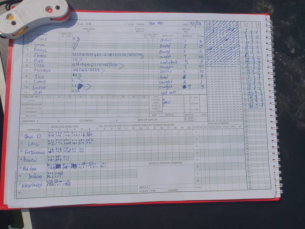 Once Mustafa was dispatched the remaining batters didn’t last long leaving the crease open for the half centurians to return. Mr Ex Hampshire was the first to return but was brilliantly caught by Hatrick taking a steepling catch whilst stepping over small children on the boundary. Fahed then returned and looked dangerous until he slashed a cut hard and low to Hoare (moved from the slips to backward point) onlookers said Hoare moved with cat like grace to fall over and catch the ball and was duly awarded PSM.