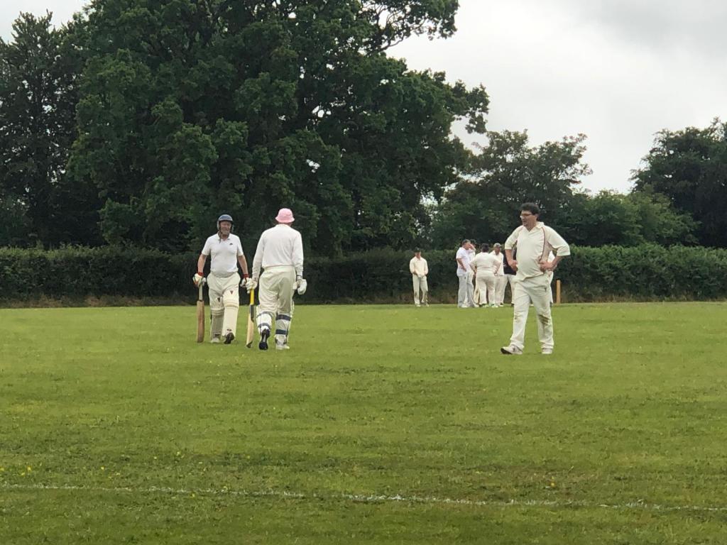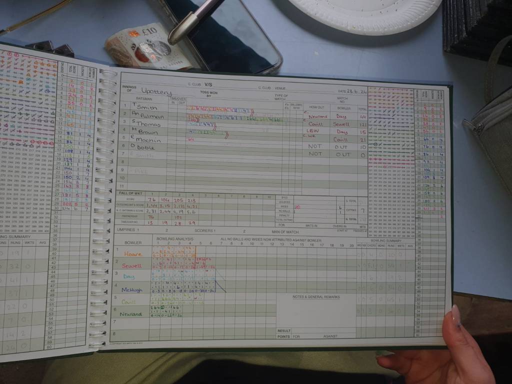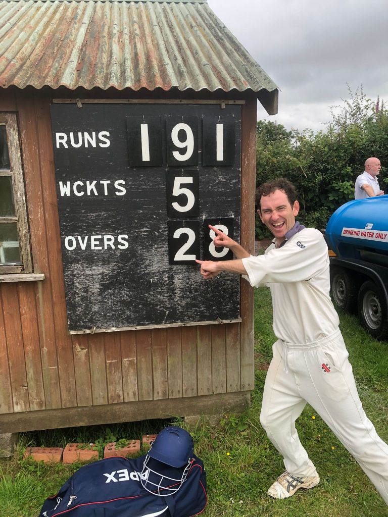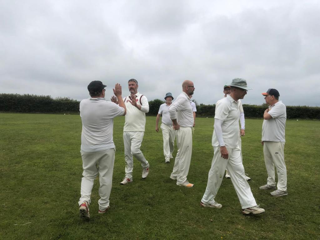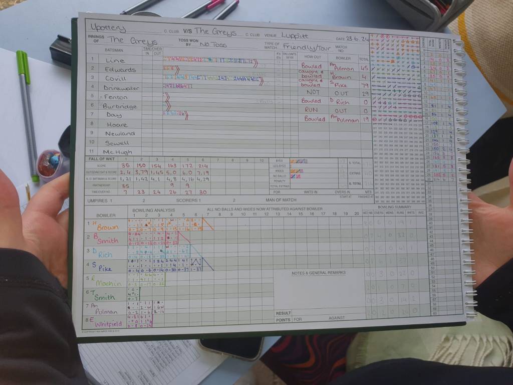 Sewell & Hoare came off after 8 overs and the game looked to be in the balance as the Upottery opening pair remained in situ but had not been allowed to dominate. Day & McHugh replaced them and both Dave’s bowled well DD taking a couple but Pullman the Upottery #2 was starting to hit his straps and get his eye in. When this bowling pair came off it was 109 for 2 off 20 overs. It looked pretty good for the Greys with a required run rate of over 10, however, what was to come was some of the most brutal hitting we have faced for a long time. Cows ran for shelter as Pullman opened his shoulders and deposited six after six into the surrounding fields. He finally went for 121 (his first century) caught unsurprisingly on the boundary by Del off EO. The damage was done and he had put Upottery in a winning position with 2 runs required off the final over. EO’s first ball wide tied the scores; second ball 4 and we were beaten.