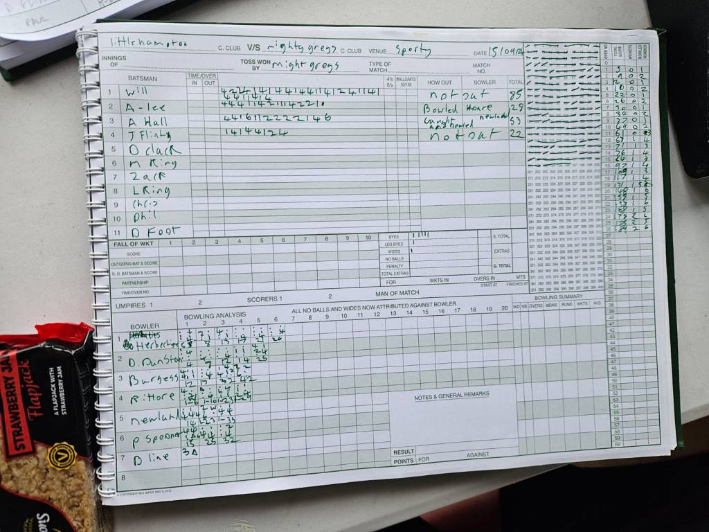 Greys front row  (me , Hat, Ad) bowled for 0 by the same bloke. Ashton Spooner enjoyed a pantastic fartnership bizarrely ending with Spen hitting his own wicket and Dom calling it squits in the same way! .Fenton hit a lovely cut for four. Newland Herbertige carried us on to somewhere near a total (191? Scorecard unclear Statto) with beaucoup sashay de skipper and entertaining Willow Wielding.