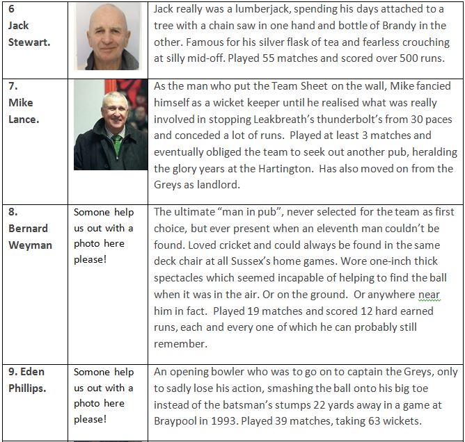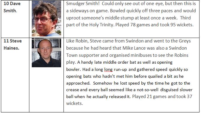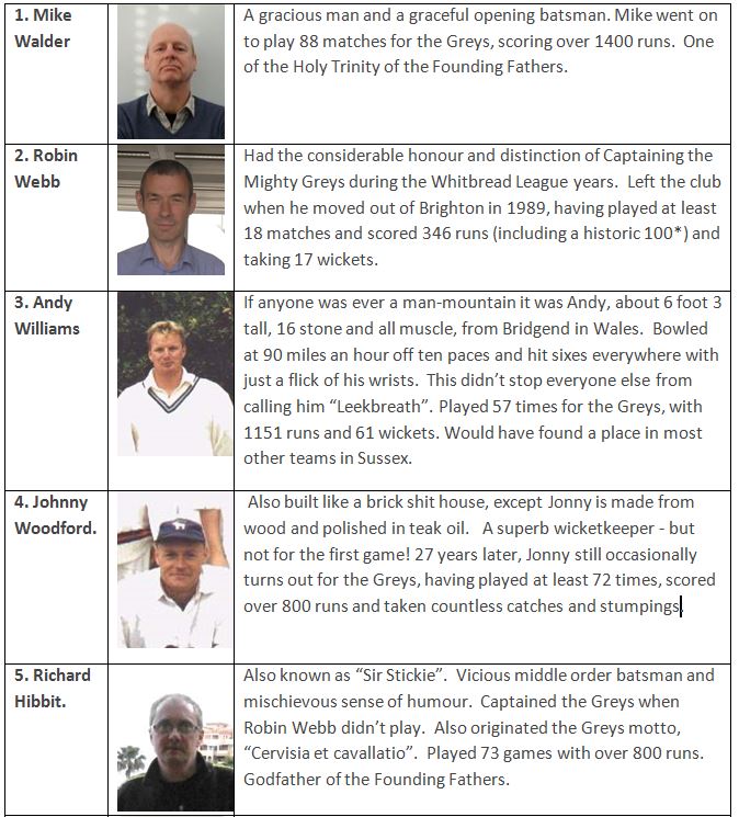 Jerry captained the team for a while and began accumulating his five thousand plus runs (and counting) for the club, Alan set a precedent for fiscal confusion as Treasurer and Richard added new matches/fixtures such as Ford Prison before Alex transformed the season by gaining acceptance from long established clubs across Sussex that the Greys were much more than a pub team.