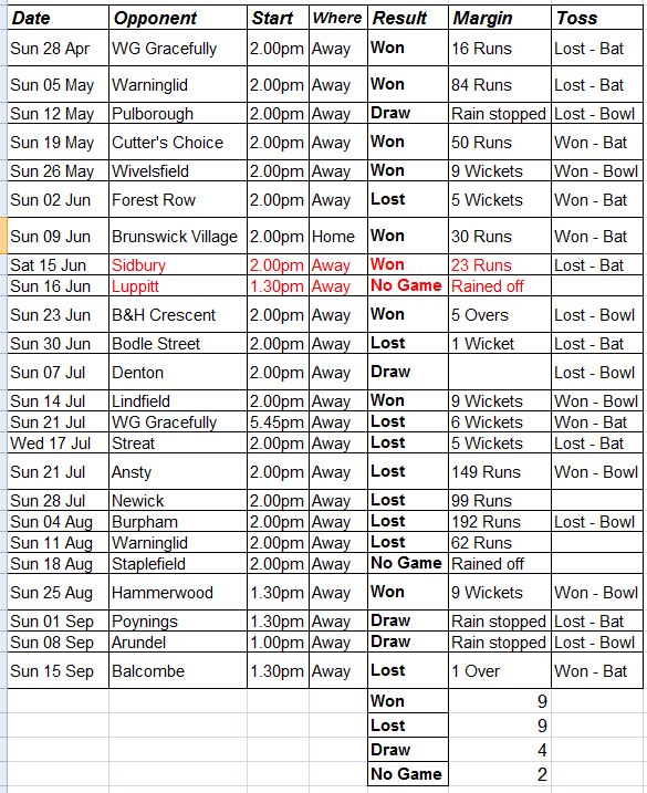19th Aug Warninglid 2.00pm away WON by 57 runs (TMG 9-161 vs Warninglid 10-104)