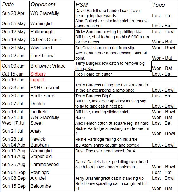 In 2013, Del boy won with his first slip flick to run out the dazed and confused man at Wivelsfield (read the match report here). In 2012 Tel boy took the honours for cruising past his 4000th run in his 250th match against Poynings (read the match report here), the year before that (2011) the overall best PSM went to EO for his heroic antics at Hammerwood to win the match (read the report here), and the year before that (2010) it was Alan “The Wall” Gallagher, for smashing his 6th four in an over at Poodle Street (read the match report here) on his way to his maiden 50. Great knock, great over, great cider, great chicken curry!! Back in 2009, Robbie took the honours for playing out the last ball in one of those legendary draws, with our back to the wall, he batted for an unexpected 27 hours to stave off the 90mph (plus) bowlers in the dark, rainy conditions (read the match report here).